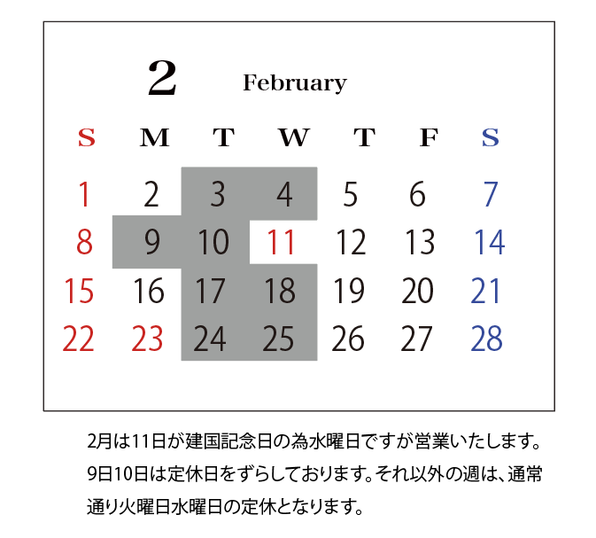 2月は11日が建国記念日の為水曜日ですが営業いたします。 9日10日は定休日をずらしております。それ以外の週は、通常 通り火曜日水曜日の定休となります。