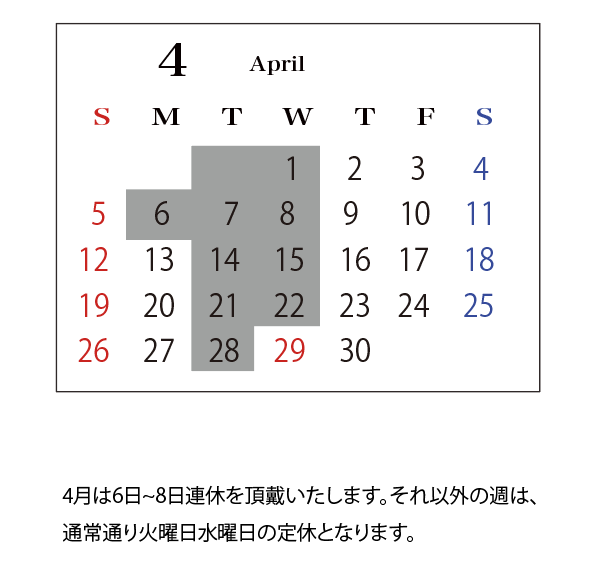 4月は6日~8日は連休を頂戴いたします。それ以外の週は、通常 通り火曜日水曜日の定休となります。